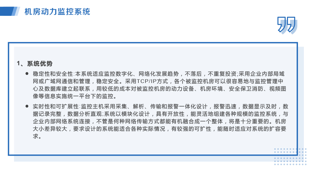 當(dāng)前位置:首頁(yè) >> 主營(yíng)業(yè)務(wù) >> 設(shè)備管理系統(tǒng) >> 機(jī)房動(dòng)力監(jiān)控系統(tǒng)
